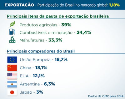 De acordo com a Organização Mundial do Comércio (OMC), em seus dados consolidados para 2014, o Brasil detém a parcela de 1,18% das exportações mundiais e participa com 1,25% da fatia global de importações. Em 2015, esse fluxo comercial somou US$ 191,1 bilhões em exportações e US$ 171,4 bilhões em importações, gerando um saldo positivo de US$ 19,6 bilhões, o melhor resultado desde 2011.